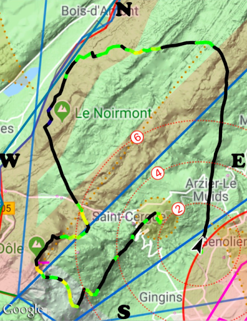 2h de vol: Passage au NO de la Dôle après avoir fait 2000, puis 2300. Noirmont à l'accélérateur, 2600, ça montait tout le long, tout droit, heureusement la zone de vol libre est ouverte. Bois d'Amont (direction le lac de Joux), puis retraversée des crêtes vers St-Georges puis retour accéléré à fond (20km/h) vers Givrins, car réunion du comité de CVLD ce soir.